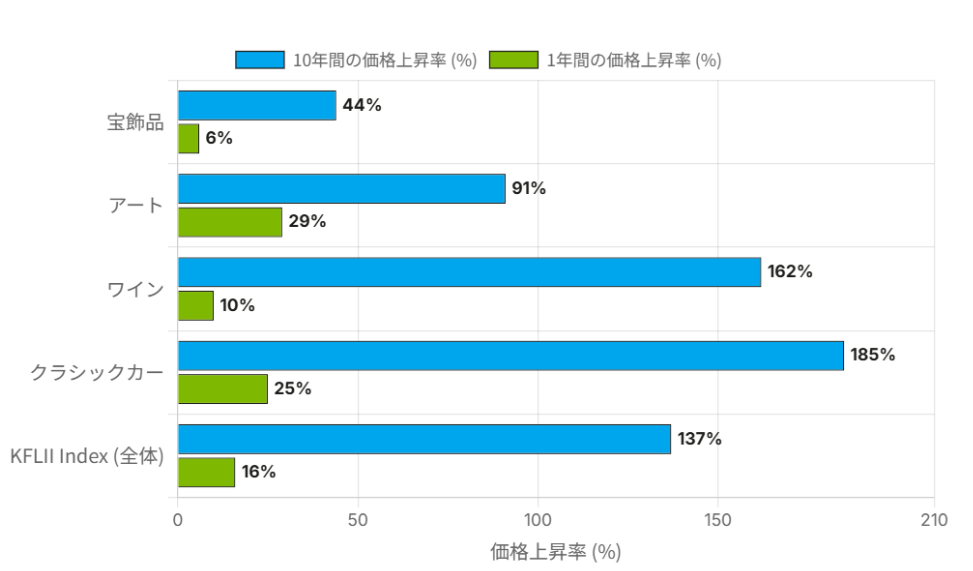 実際に、英不動産コンサルタント会社Knight Frank(ナイトフランク)のラグジュアリー投資指数によると、クラシックカーの価格は過去10年間で185%も上昇しており、これは美術品や高級ワインといった他の実物資産を大きく上回るパフォーマンスです。