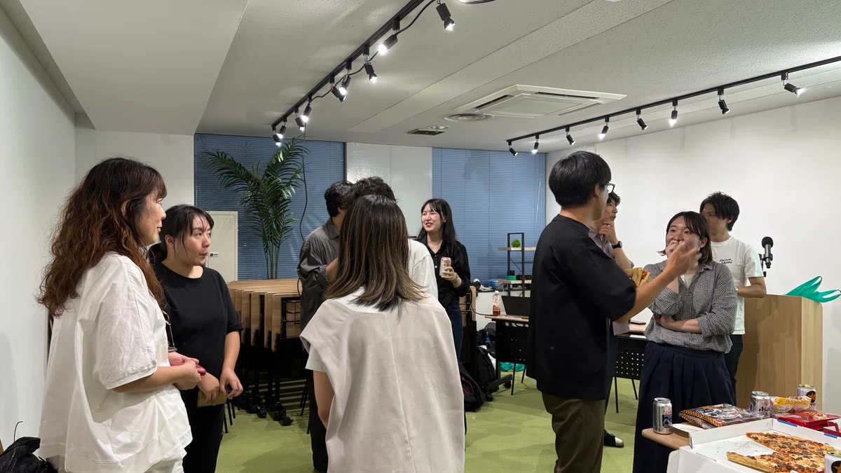 勉強会のあとは、いよいよ楽しい交流会です! お酒を片手に乾杯し、ピザを囲んで和やかな雰囲気でスタートしました。