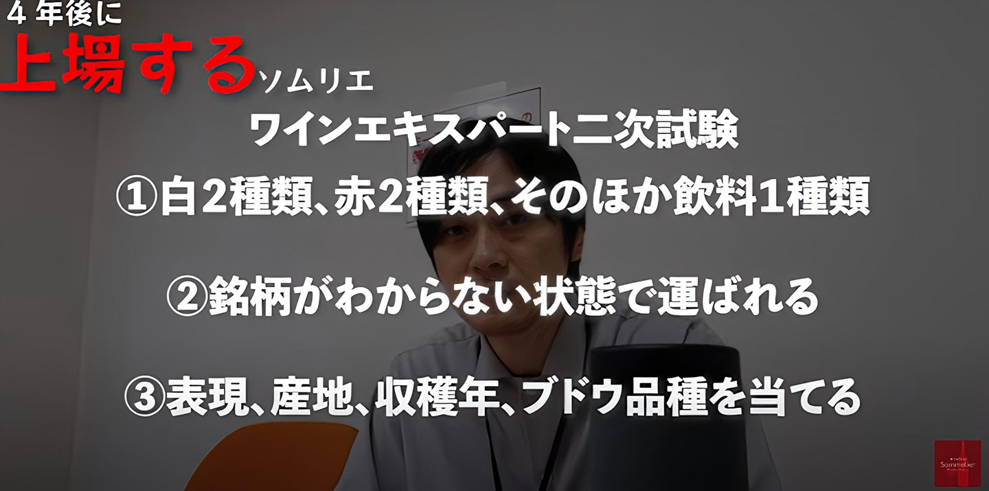 ワインエキスパート試験は、日本ソムリエ協会(J.S.A.)が主催するワインの知識を問う資格試験です。ソムリエ試験と似ていますが、飲食業などの実務経験が不要なため、一般のワイン愛好家でも受験可能です。なんとこの時点で篠澤さんは1次試験を突破されていたので、二次試験にフォーカスした動画となっています。