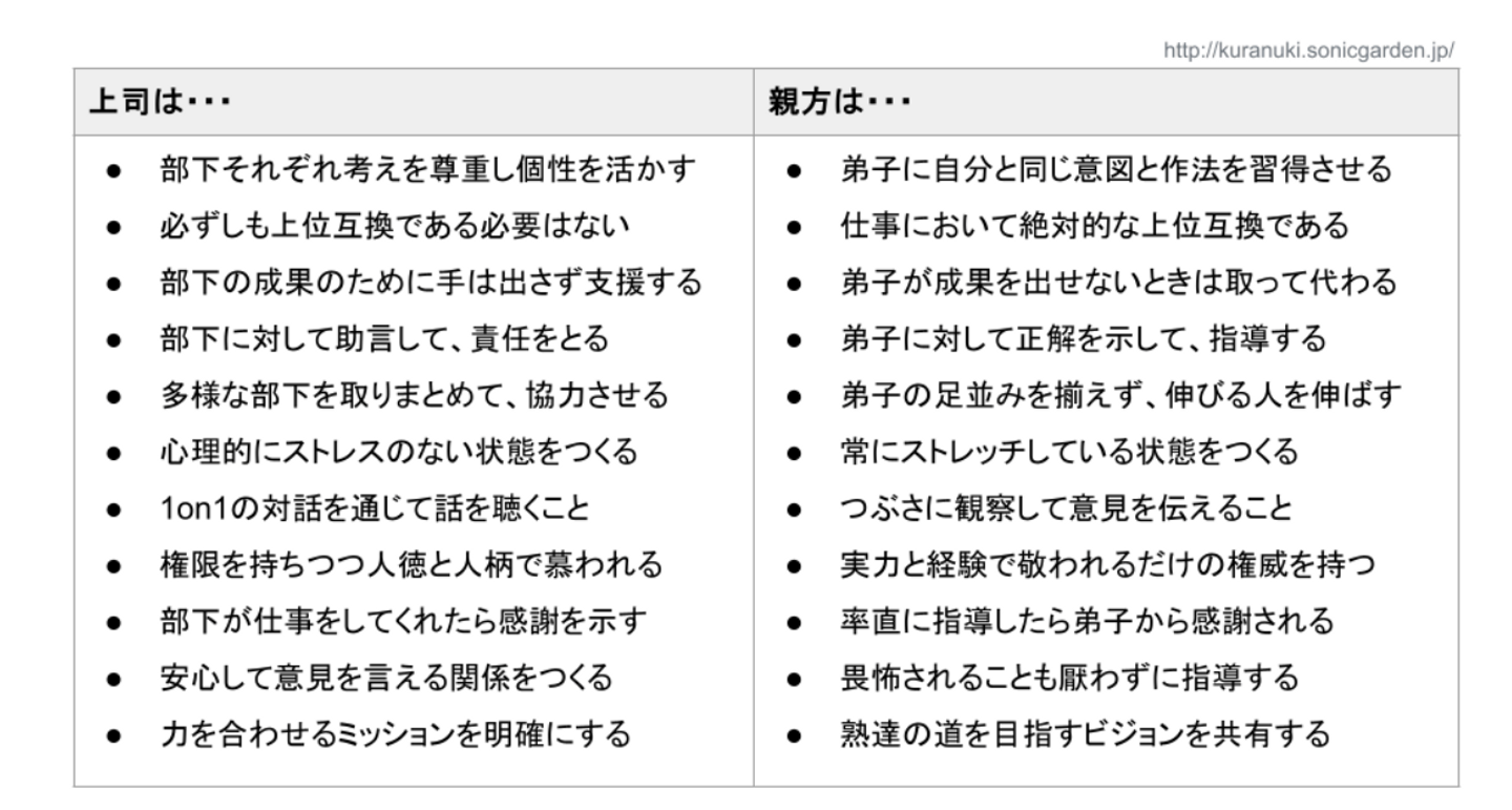 これまでであれば、倉貫が直接各メンバーと接しながら、ソニックガーデンの仕事への流儀や文化を伝えることができました。しかし、これからは、徒弟制度を中心にミドルマネジメントを通じて、組織の理念を伝えていく必要があります。