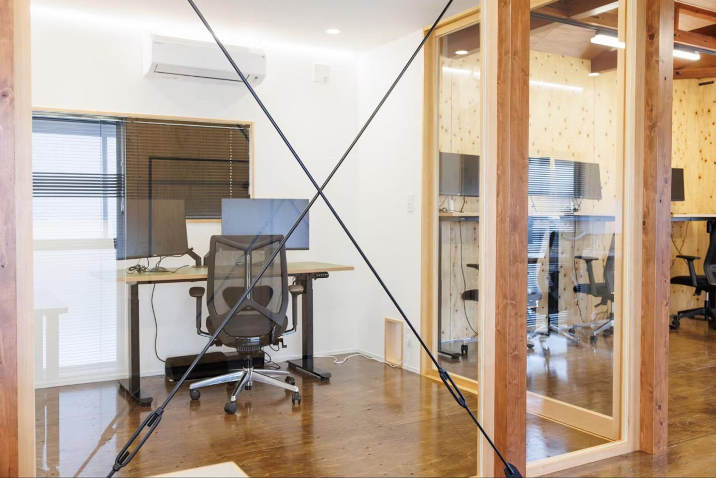 結果的に、一人ひとつのスタンディングデスク、勉強会用のスクリーン、キッチンやロフト、シャワーなど充実した設備と働きやすいオフィス設計が実現しました。こだわりは、ガラス張りの親方ルーム。防音になっており、音は漏れないものの、お互いの存在を感じながら仕事ができるように工夫されています。