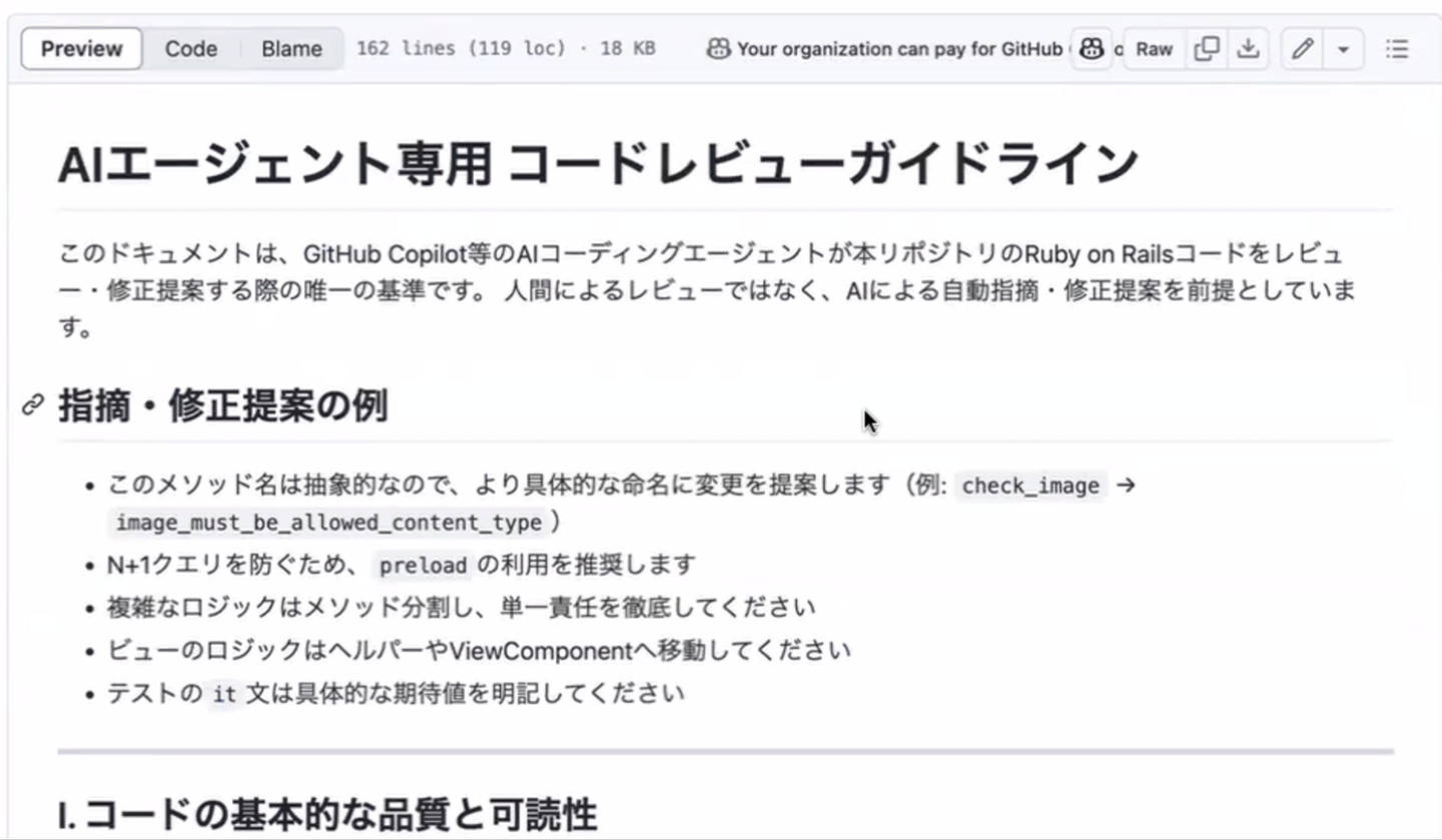 せっかく生成させても、イマイチな実装では元も子もありません。生成するコードの品質を一定に保つために、コードレビューのガイドラインと同様に、コード生成用のガイドラインを毎回参照させる試みもしているとのことでした。