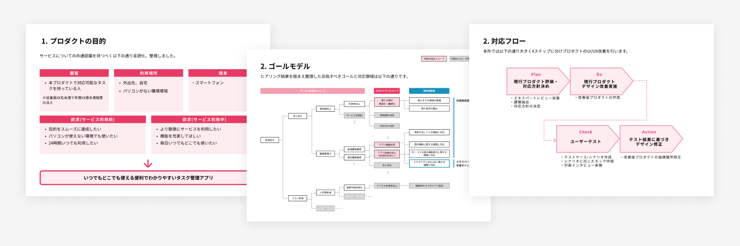 この社内プロジェクトでは、デザイナーとディレクター・PMが共同で、私たちの”UXデザインの知見”を商材としてどのようにアウトプットしていくのか、広げていくのかを検討したり、UXデザイン案件を社内で実際に行っていく時の体制やプロセスを考えたり、全社への知見の浸透施策を考えたりしています。