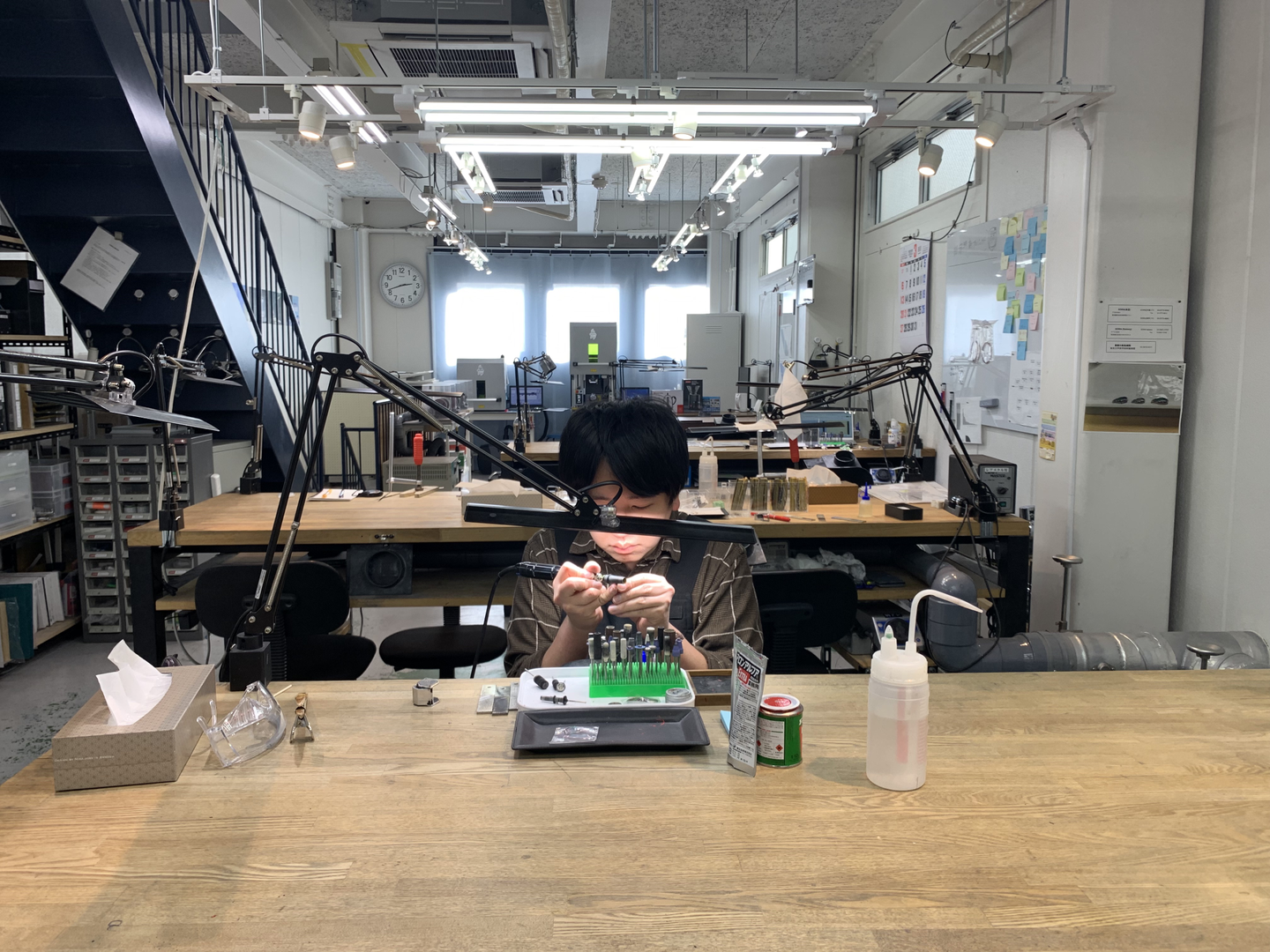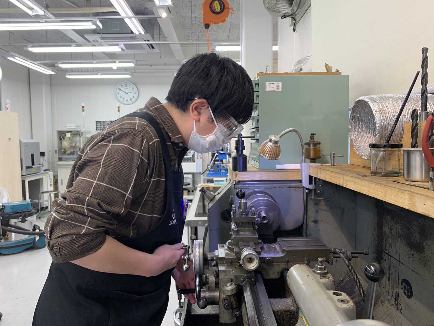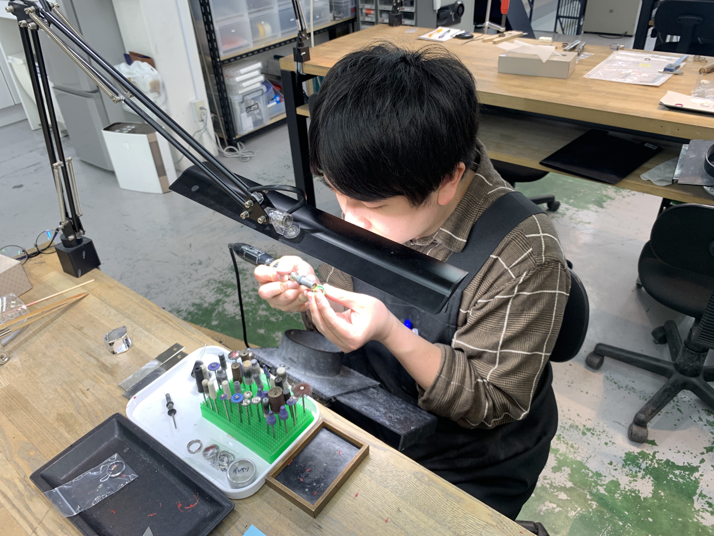 先輩たちの就職先は、某大手玩具メーカーやインテリア会社が多かったので、僕もそうなのかなと思ってたんですど、ちょうど4年生の時に彫金の動画をYoutubeで見たんです。職人さんが指輪のリメイクをしている動画でした。それがとってもカッコよかったんですよね。僕は、ものづくりがすごく好きなんですが、プロダクトは手作業を中心に学ぶわけではないので、もしかしたら工芸科のほうが向いているかもしれないと悩んだこともありましたが、色々学べる学科だったので、趣味で彫金とかできたらいいかなと思ってました。