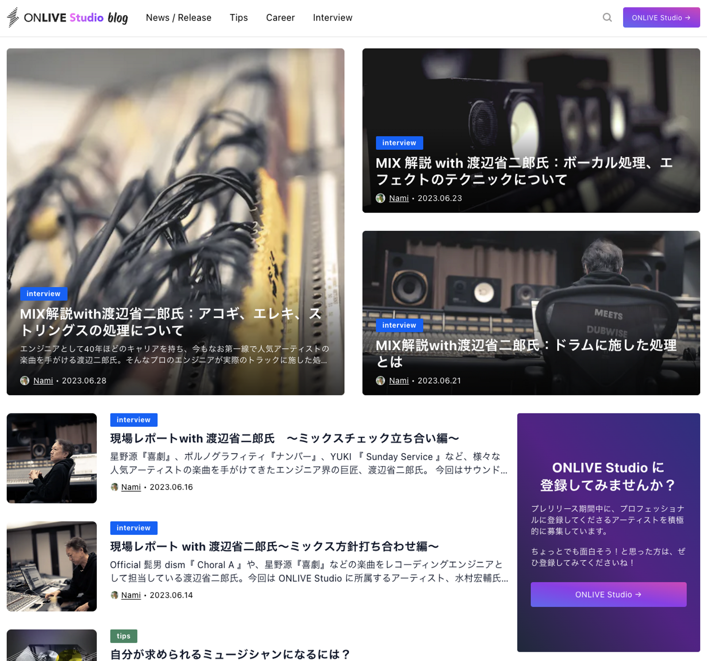 『 ONLIVE Studio blog 』の運営には、私を含め、音楽経験があるスタッフ、現役でアーティスト活動や音楽制作を行っているスタッフがいます。実際に経験があるからこそ分かる、読者が知りたい情報、音楽に関わる人たちにとって興味のある話題を皆様にお届けできるのではないかと思っております。