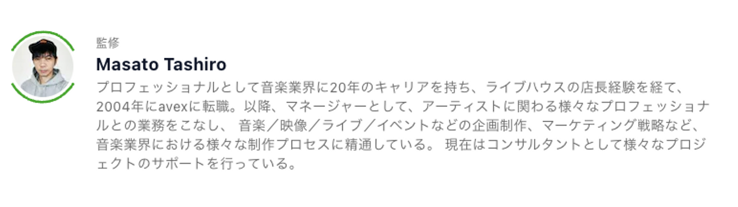 記事の多くは音楽業界に精通する専門家 Masato Tashiro さんに監修を依頼しています。 Masato Tashiro さんは音楽業界で約20年のキャリアを持ち、大手レーベルの第一線で活躍するアーティストのマネージャーとして現場を経験されています。特に、音楽に関わるキャリアや案件受発注に焦点を当てた記事は、検索をかけてもなかなか情報が少ないのが現状です。