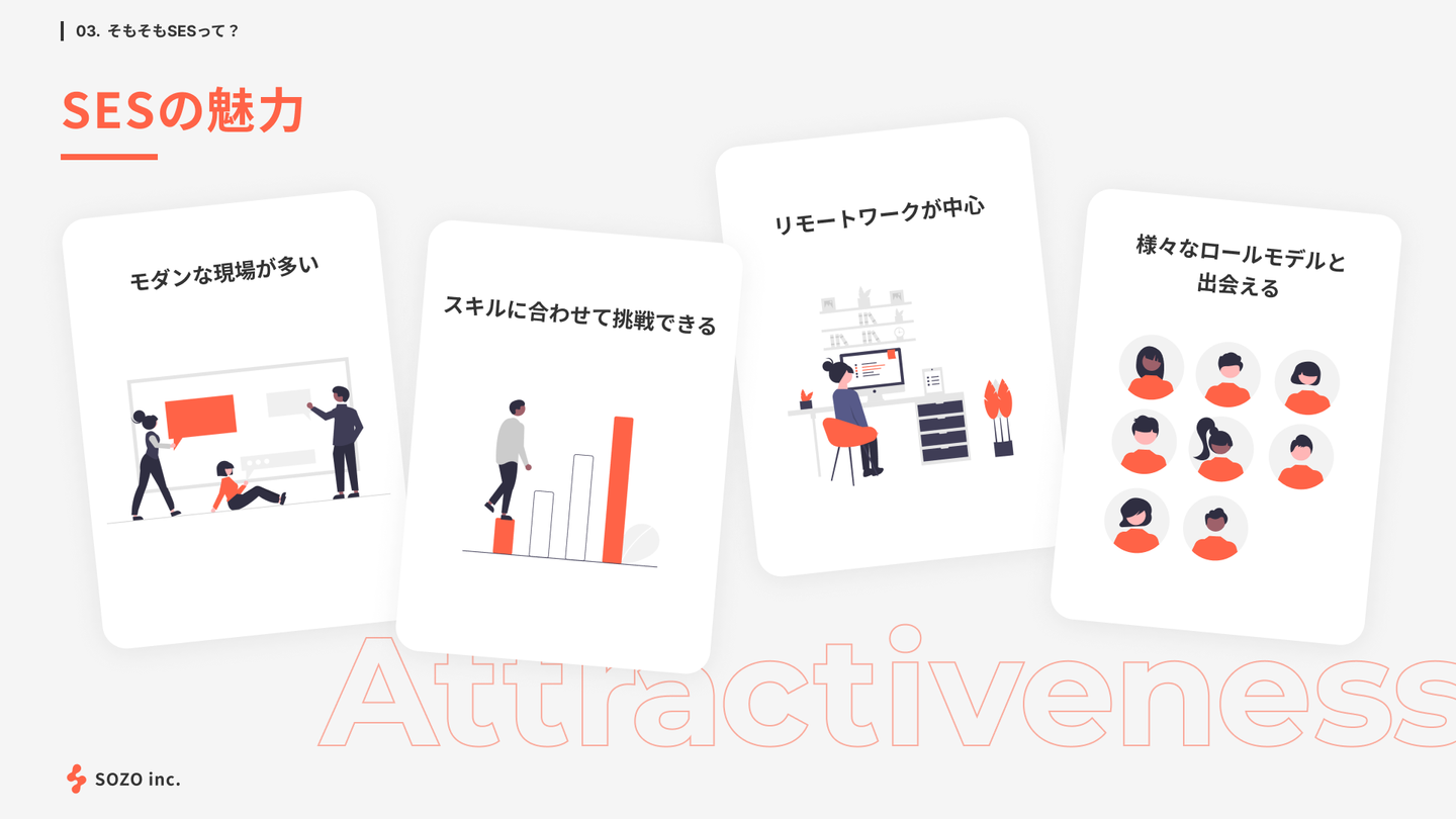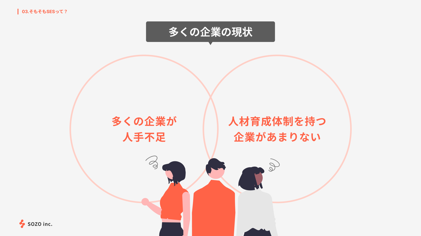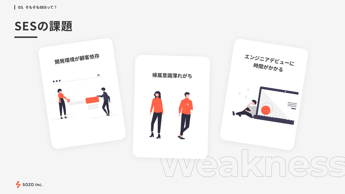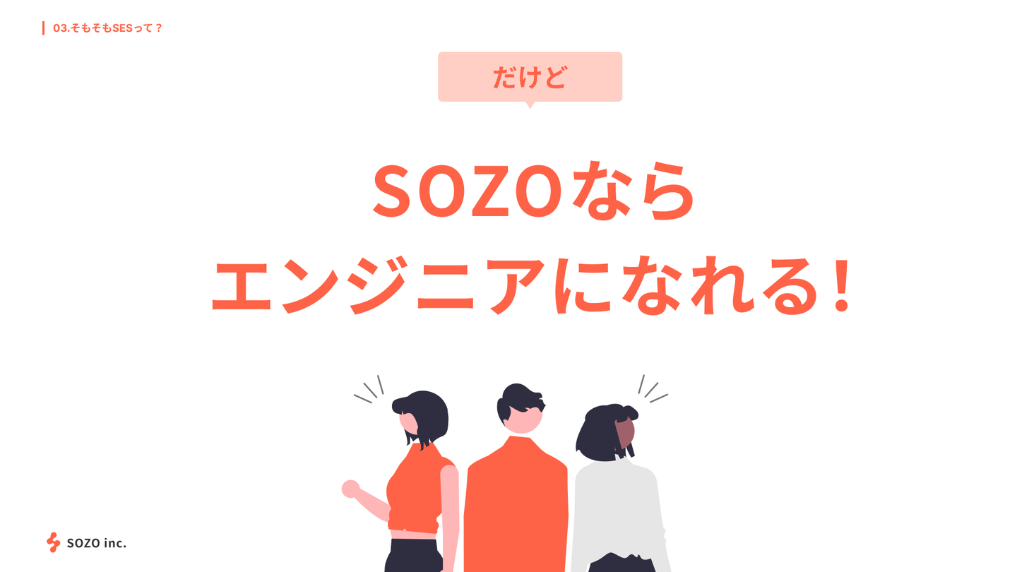 エンジニア: 実際に現場で働く人上記で言うところのSES企業が株式会社SOZOに当たります。