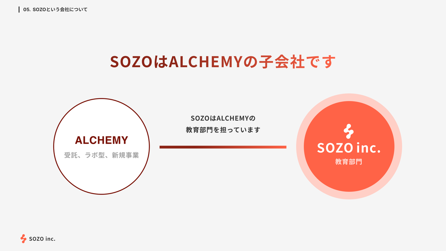 SOZOは2024年10月に設立された会社ですが、株式会社ALCHMEYから教育部門を切り離し、分社化して誕生しました。