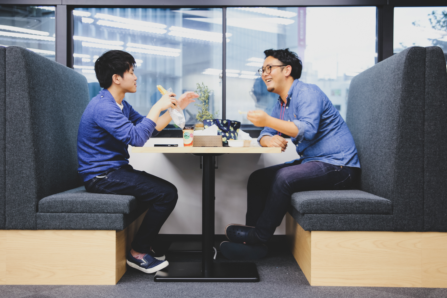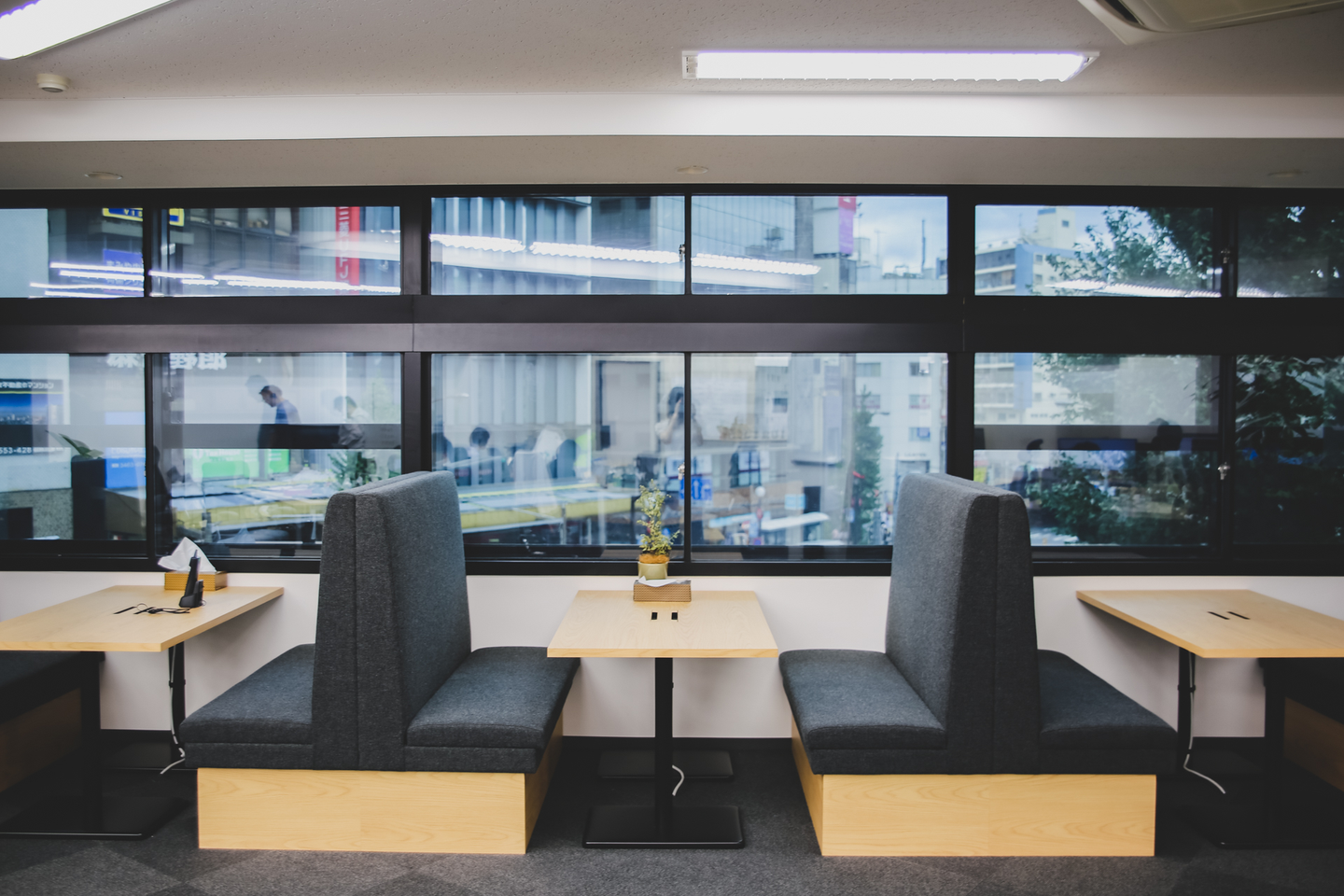 窓際にはファミレス席を完備。簡単なディスカッションをしながら仕事するもよし、ひとりでのんびりするもよし。ご飯だって食べられちゃいます!