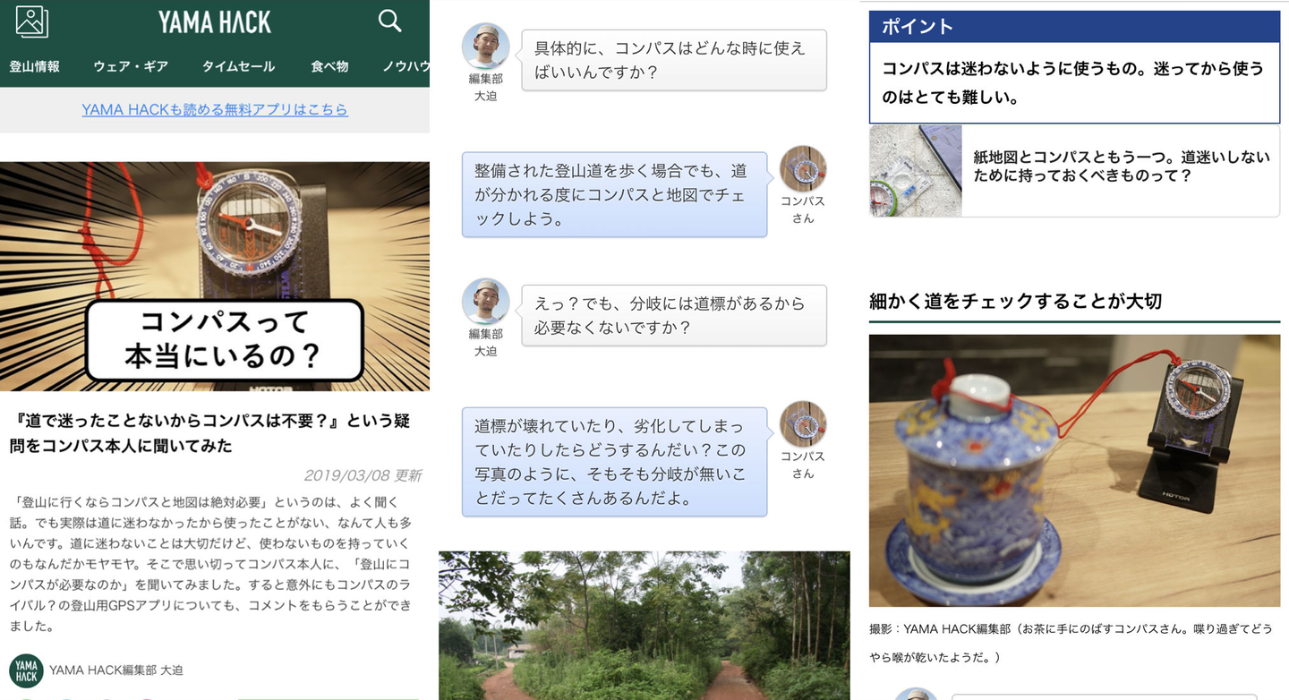 『道で迷ったことないからコンパスは不要?』という疑問をコンパス本人に聞いてみた(https://yamahack.com/3177)という記事です。なかなか興味をもってもらえないテーマに対し、まずは記事に興味をもってもらいたい。「記事をクリックすること」にフォーカスしました。安全登山に関する記事は「やめましょう。危険です。」と真面目に伝えることが鉄則でした。というか、それ以外にない。故に、興味を持てない=読んでもらえないという状況になっていました。この記事では読んでもらうとわかるんですが、コンパスに人格を持たせて、コンパスにインタビューしています。興味をもってもらうために、ユーザーさんをだますくらいの覚悟で挑みました。