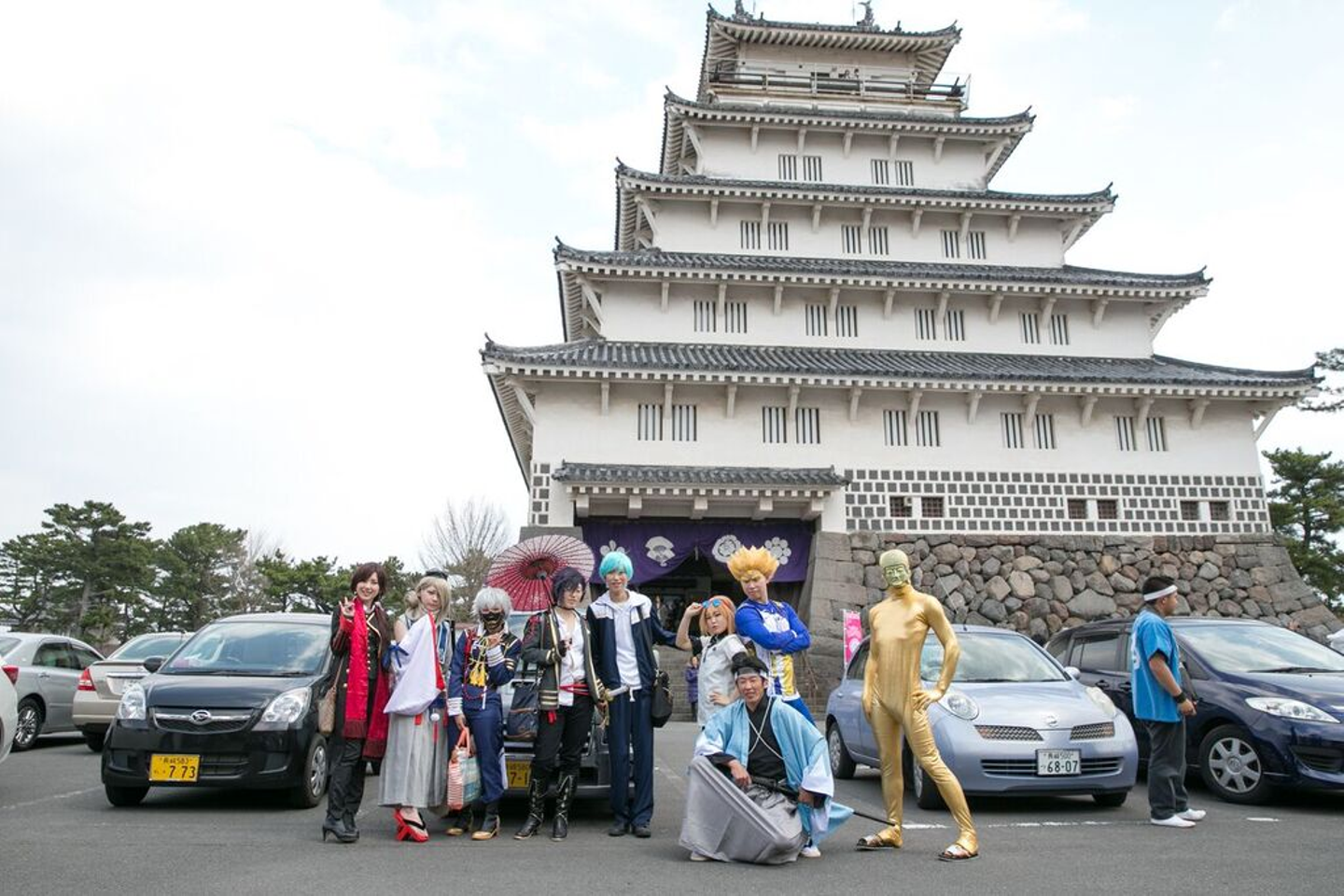(島原城で撮影するコスプレヤー。地域外から100名のコスプレイヤーが島原に来てくれました!!)