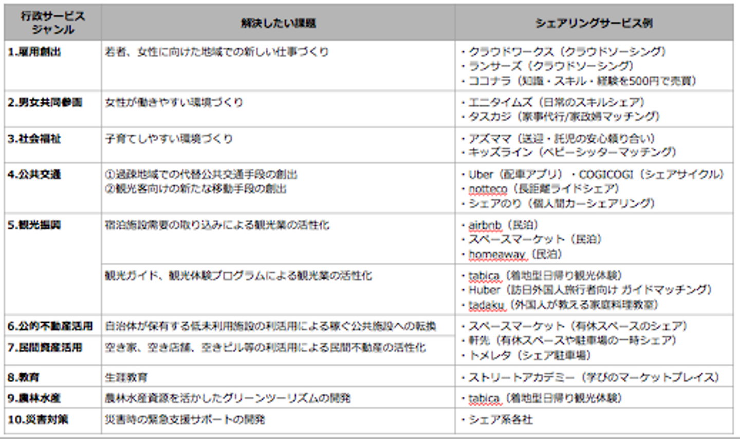 (行政サービス&課題とそれに対応するシェアリングサービス例)