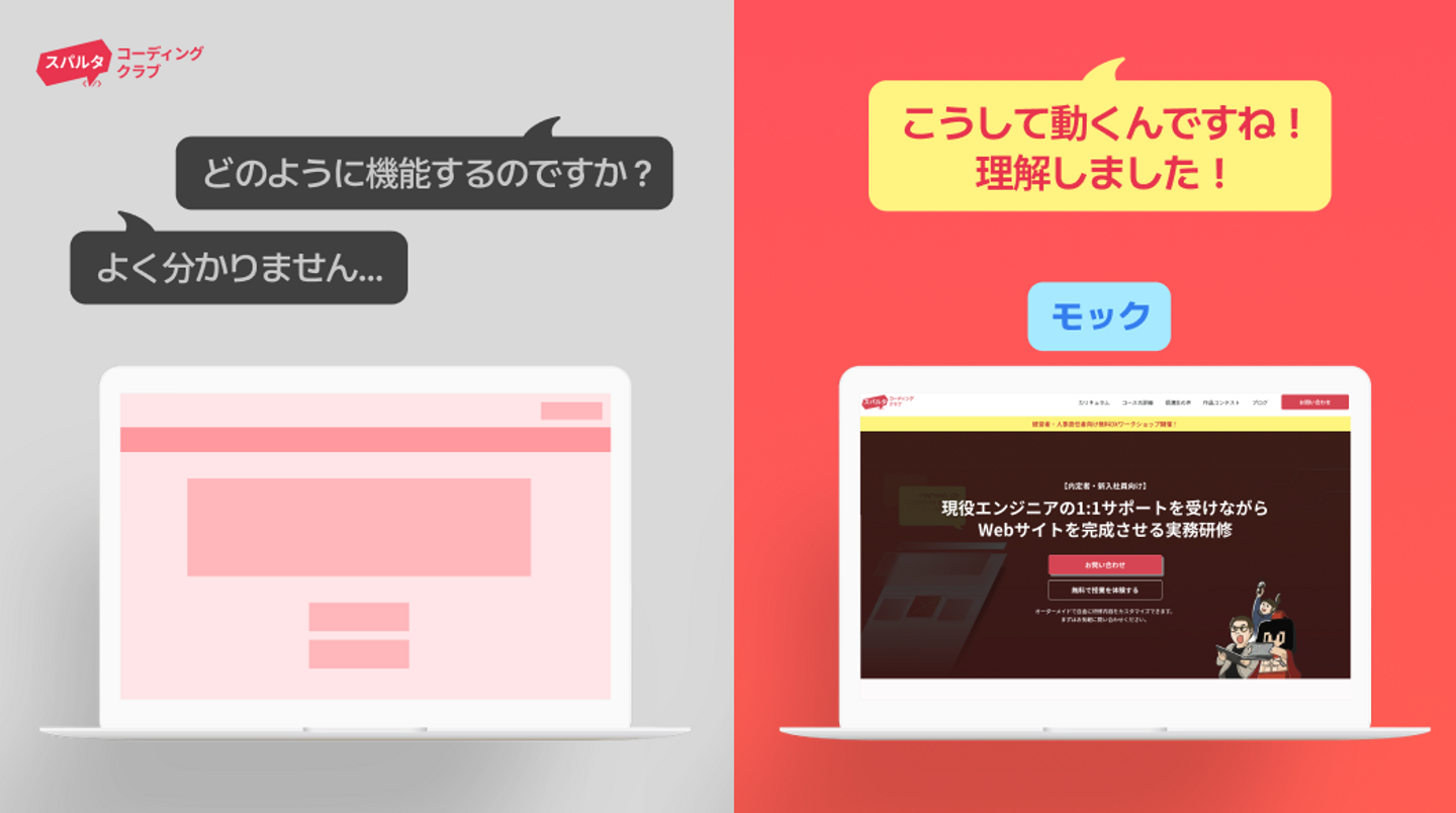 現在の仕事ではモック(Mockup)の作成を通じて、お客様と協力してプロジェクトのゴールを描いたりしています。