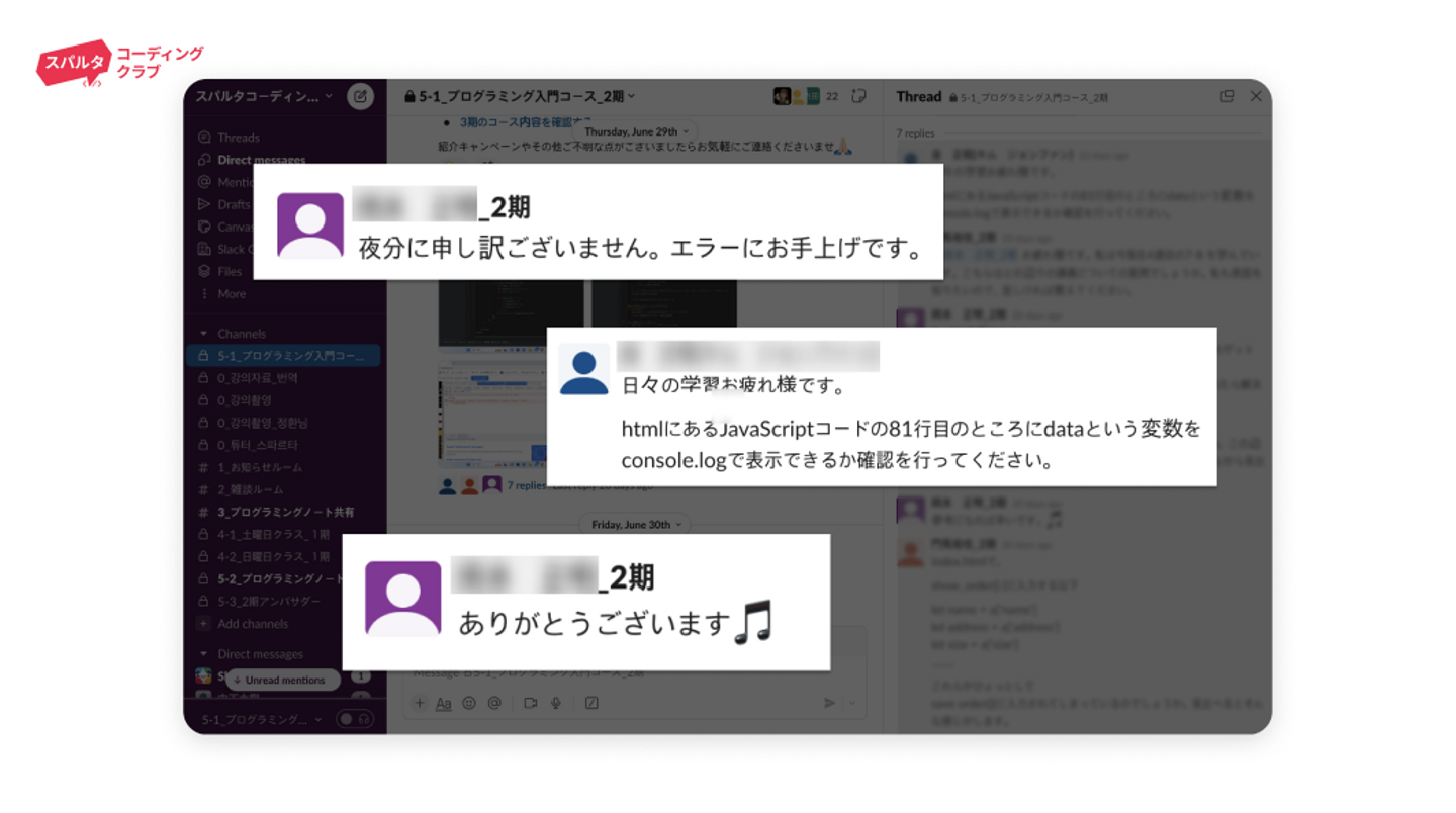 動画で学習といっても、スパルタコーディングクラブは進捗確認もそうですし学習内容を定期的に確認しながらアドバイスを提供してくれるので、誰かに支えられているって感じながら学習できています。