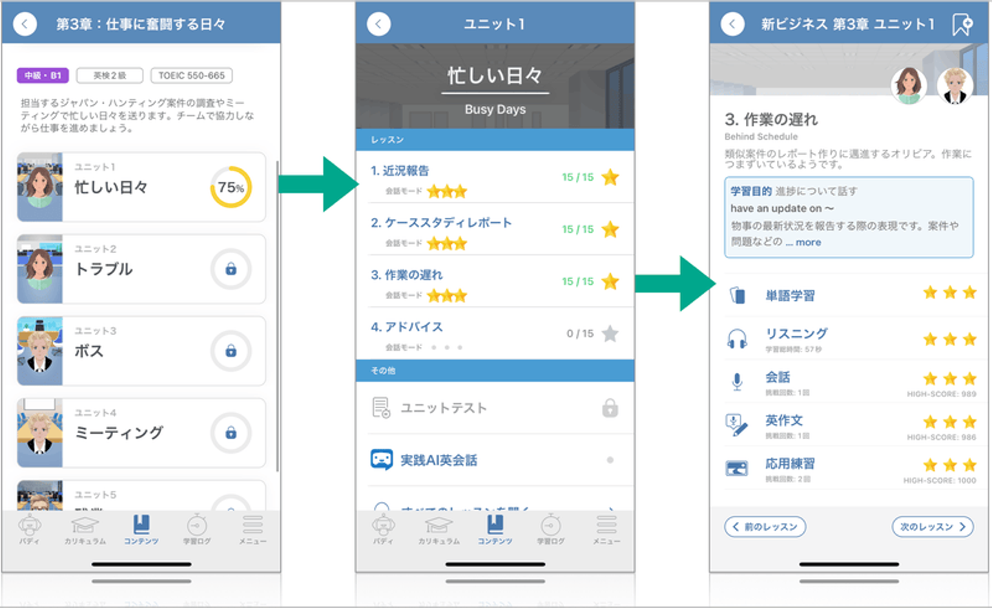 SB:もしかしたら最初は繰り返しが多いと感じるユーザーもいらっしゃるかもしれませんが、理論上も学習効果があるといえるのですね。確かに一つのレッスンの中だけでも、フレーズ・単語を反復して口にすることになるので、使っていると段々と定着していることに気づきます。