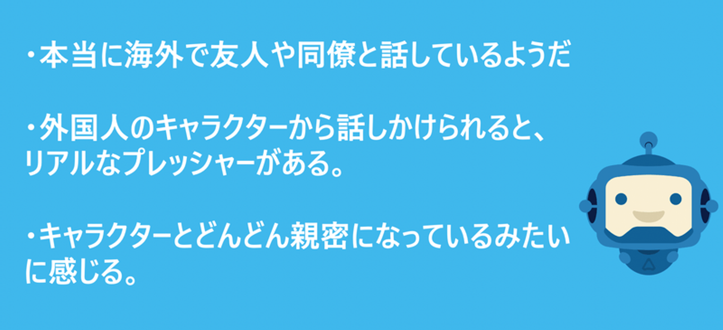 先生(続き):出発点に「現実に起こりそうな問題に挑戦」とありますが、スピークバディのコンテンツは、ユーザーの身に「現実に起こりそうな問題」を提示しています。ビジネスシーンであれば例えば「契約を取るという課題」。スピークバディではこれを実に細やかに描写していますよね。これが、臨場感を感じるような、「ほどよい現実感」につながっているのではないでしょうか。