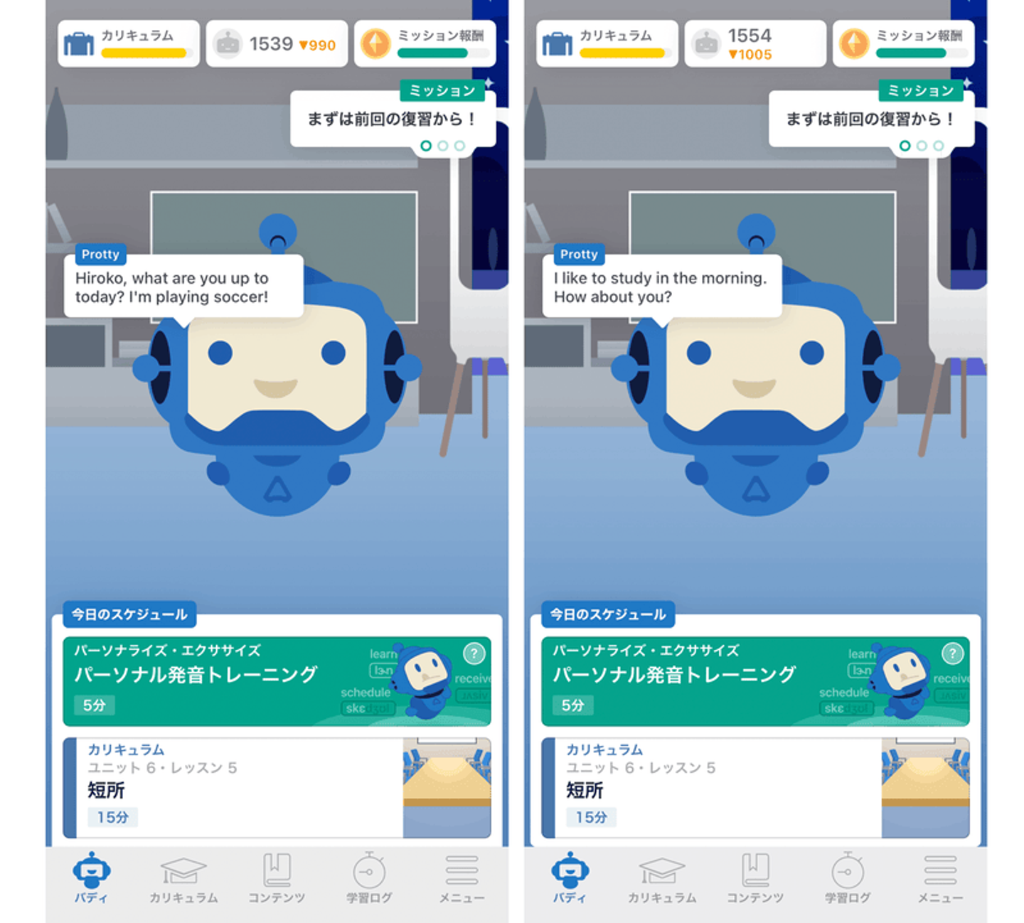 先生:今日は起動した直後の画面(「バディ」ページ*)で、キャラクターのプロティに「カレーを作ったよ」と言われましたが、そこから会話が発展して、こちらのメニューを伝えたり、カレーのレシピを聞いたりしても良いですよね。