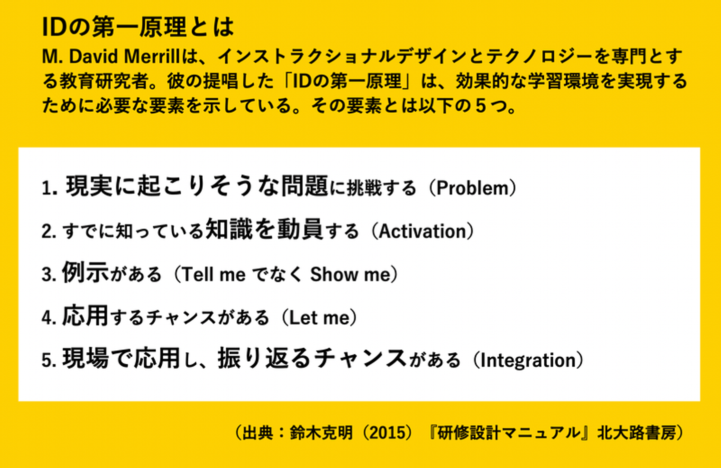 藤本先生(以降、先生):これは「IDの第一原理(M.デイビッド・メリル)」に沿って解説しましょう。この原理は効果的な学習のための要素を過去の研究などから抽出したもので、5つあるとされています。