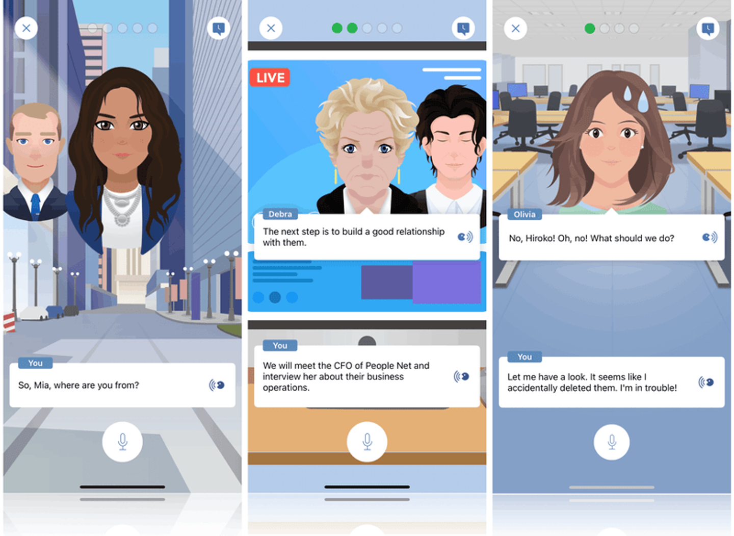 SB:「場面・環境」で言うと、スピークバディは細部に工夫をこらしていて、オフィスであれば周囲の話し声、カフェであれば店内に流れている音楽が聞こえてきますし、キャラクターごとの性格や彼らとの交流も「問題の質」に関わりますね。また最近のアップデートでは「リモートワーク」についての会話や「オンラインミーティング」のシーンを入れたり、社内のコミュニケーションは「チャット」を前提にしました。これによりさらに身近で具体的な場面になっていると思います。