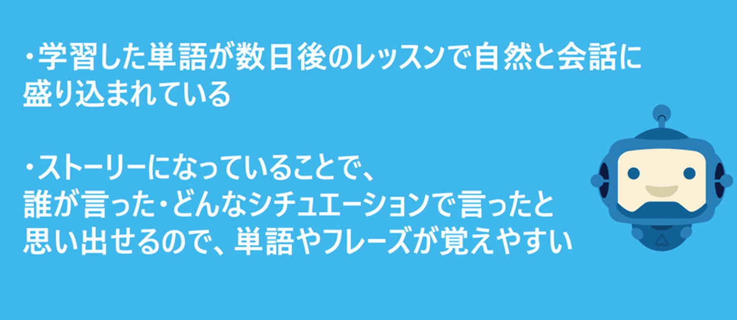 またストーリーが続いていることで、自然に以前に学んだ単語やフレーズが出てくるようにしています。これについても