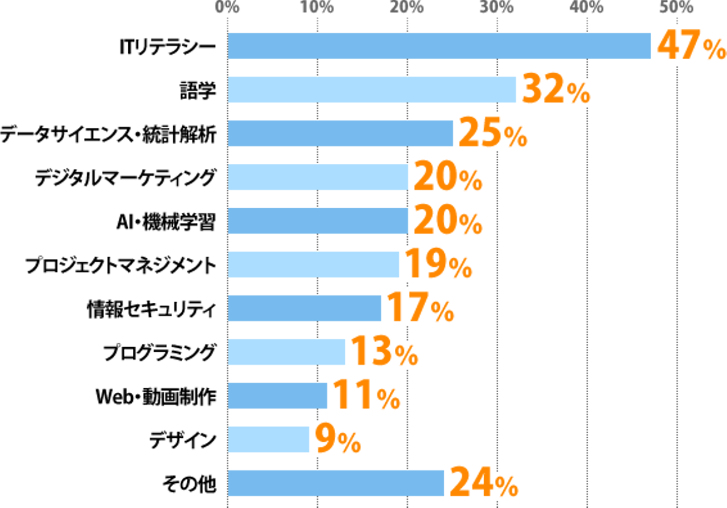 リスキリング文脈で主に言及されるテーマは、「プログラミング」や「マーケティング」「DX」といったIT分野ですが、前述のような状況もあり、必ずと言っていいほど「語学」も上位にランクインします。