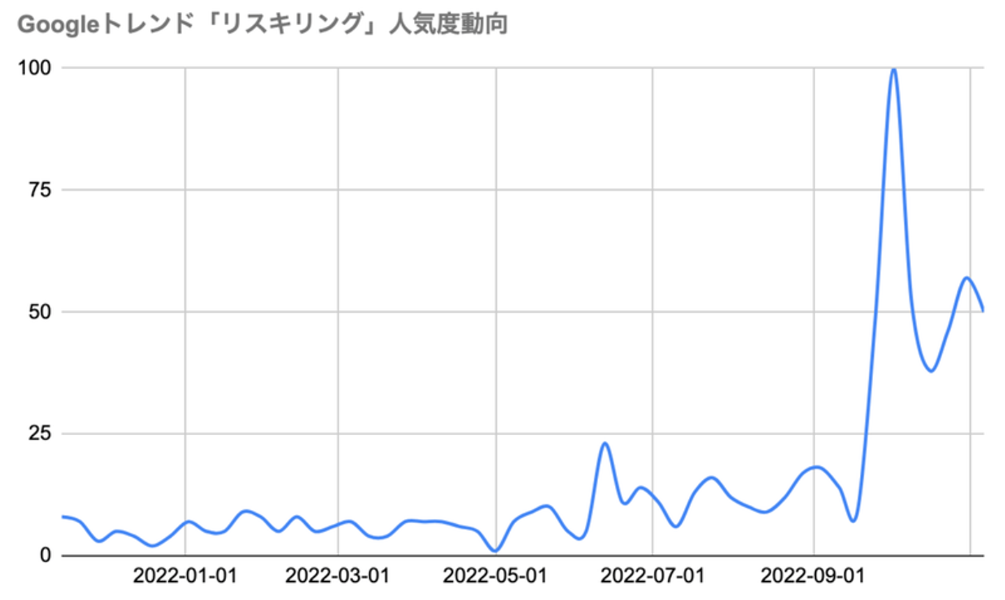 と定義されています。2022年に入ってから少しずつ注目され始めてきたこのワードですが、先月10月の政府の発表で更なる加速が見込まれています。Googleトレンドで「リスキリング」の人気度を見ると、この数ヶ月〜半年で急激に検索結果が増えていることからも、実際に注目度合いが高まっていることが伺えます。