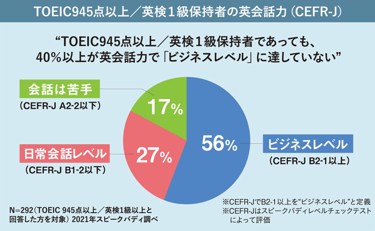 スピークバディが実施しているレベルチェックテストの結果(期間:2021年9月1日〜10月4日)によると、過去の英語の試験結果を「TOEIC®945点以上/英検®1級以上」と回答した方のうち、半数以上(54.6%)がビジネスレベル未満の英会話力であることが判明しており、「たとえ検定スコアが高くても、思い通りに話せない」、いわゆる“スコア依存の学習者”が多くいることが明らかになっています。