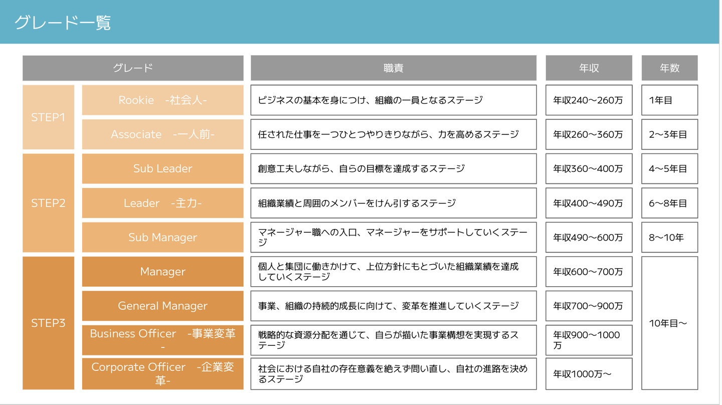 グレードは入社後Rookieから始まり、各グレードに用意されている条件をクリアしていくごとにグレードが昇格していくという流れになります。