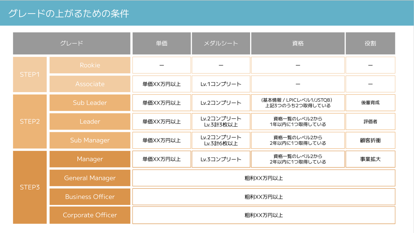 GeneralManager以上は例外になってくるのですが、基本的に昇格の条件として、メダルシートの進捗・単価・資格取得状況の3つの基準がそれぞれ設けられています。