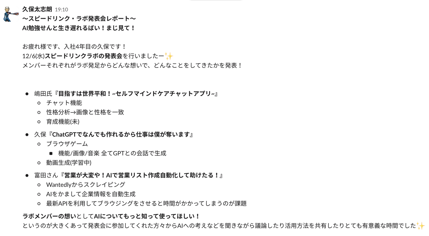 毎週社内のコミュニケーションツールであるSlackで活動内容を報告してくれています。