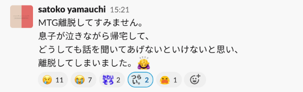 私だけでなく、みんなが様々な状況や環境の中で働いているわけですから、自分本意でなく周囲を思いやりながらコミュニケーションがとれる人が増えると、そんな人たちと一緒に仕事をしたいと思えるし、チームや関わる人のために頑張ろうと感じられますよね。