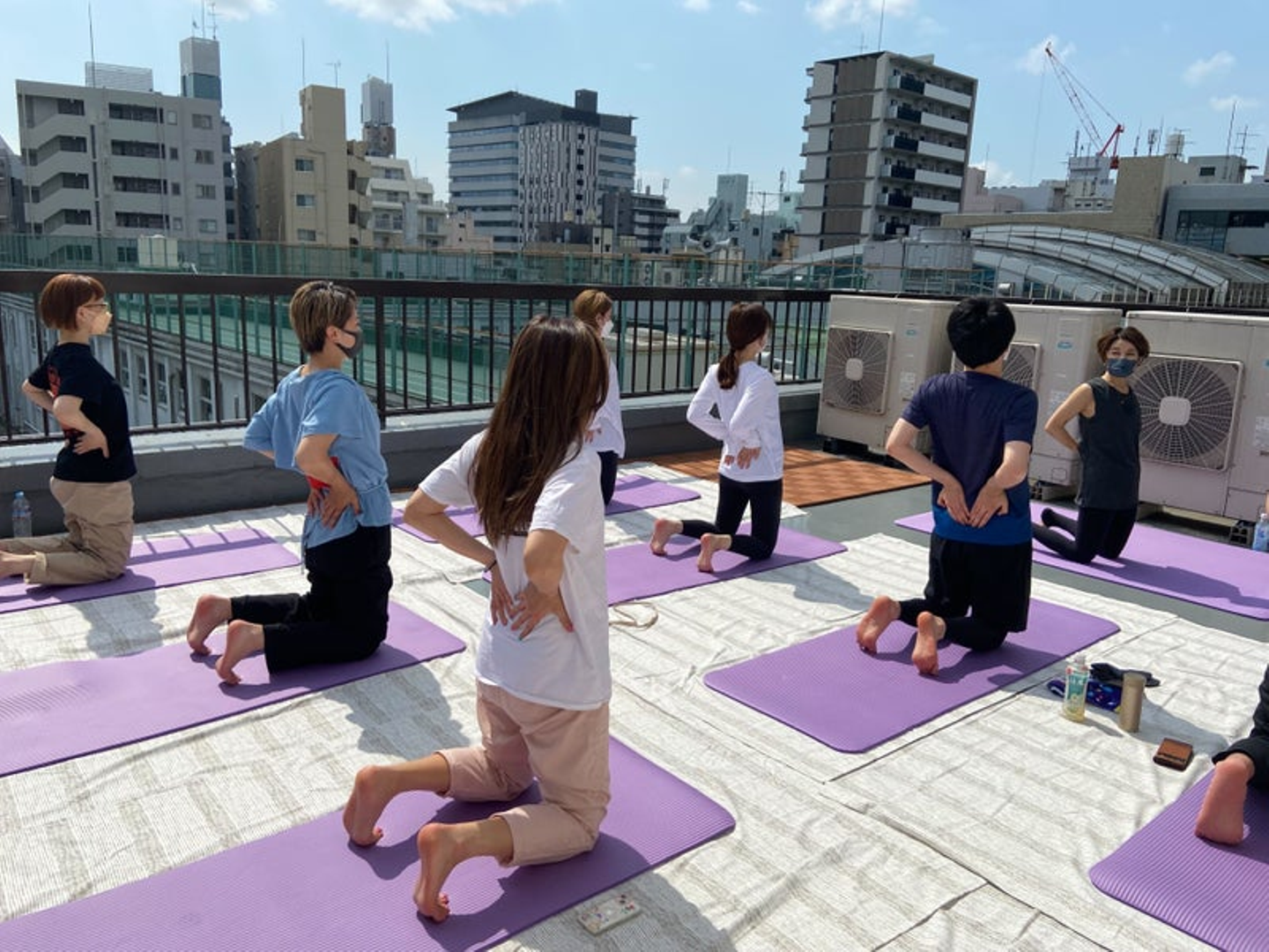 朝ヨガは、オフィスの屋上にて開催されました。開催日は快晴だったため、気持ちよくヨガをすることができました。