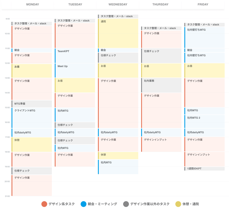 スケジュールを組むにあたり、私はいつも「まとまった作業時間を確保すること」を心がけています。例えば作業30分→MTG→作業30分→MTG…といった細かい時間配分が続くと集中して作業に取り組むのは難しくなります。