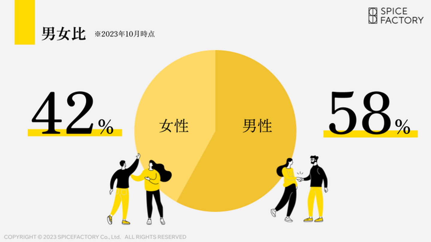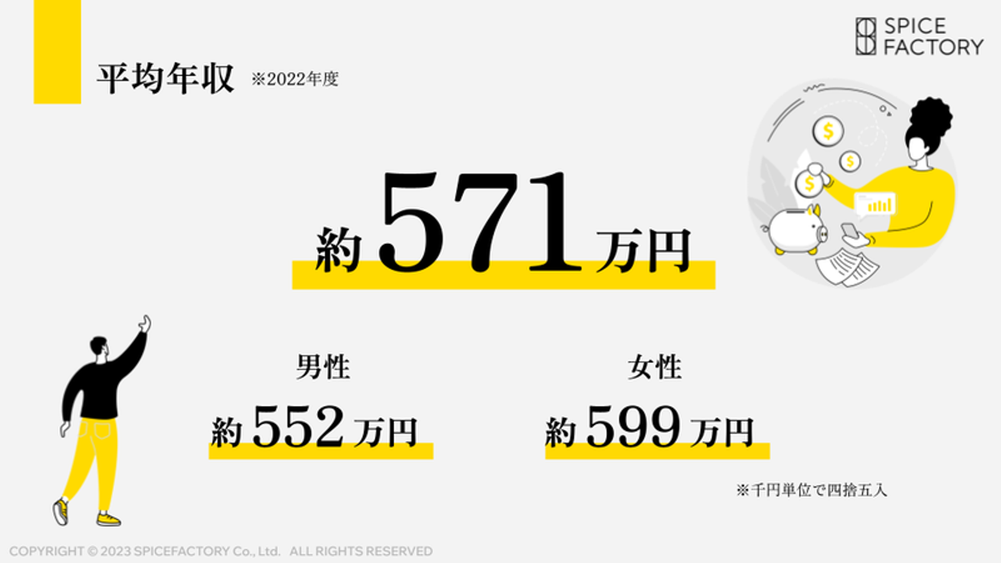 業界水準で最も驚かれる特徴の一つとして、スパイスファクトリーでは現在日本で問題となっている男女の賃金格差に大いに貢献しており、その結果、平均年収では女性の方が高いという事実があります。