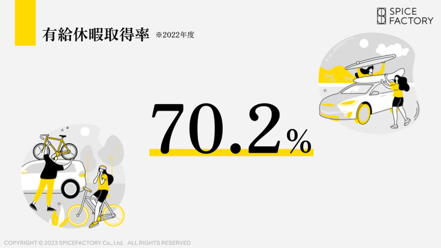 有給休暇の取得率は70.2%となっています。休暇を取得する余地はまだありますね。有給休暇を利用して長期休暇を取り、旅行に行く社員もいて、オフィスのコミュニティスペースにはよくお土産が並んでいます!