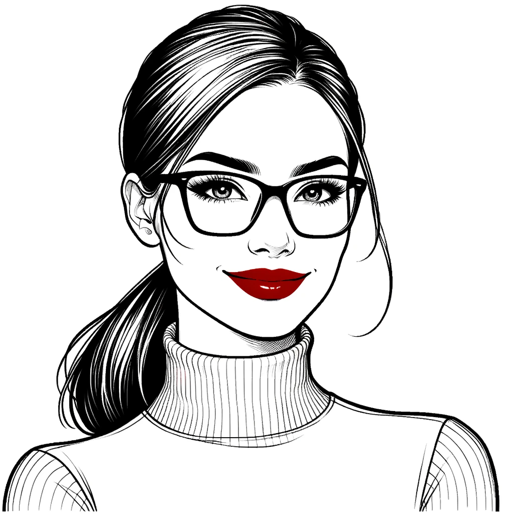 「黒髪」「ロングヘア」「ポニーテール」「赤い口紅」「微笑み」「黒ぶち眼鏡」「タートルネック」「センター分け」など。ただ、同じ画像の一部を修正するということはできなかったので、毎回プロンプトを試して画像を作り直す作業に…。はじめての制作はなかなか苦戦しました。もし、もっといいプロンプトなどがあれば、ぜひみなさん教えてください!