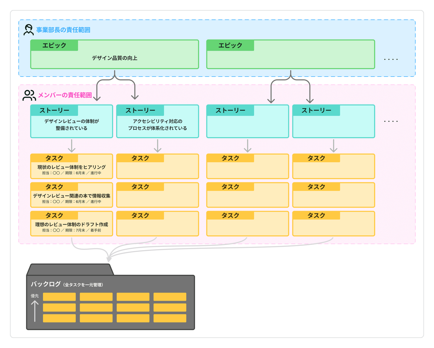 事業部長が、チームとして取り組むべき大きな年次テーマを「エピック」として定義し、それをメンバーが「ストーリー」(具体的な課題)に分解、さらに「タスク」に落とし込んでいます。