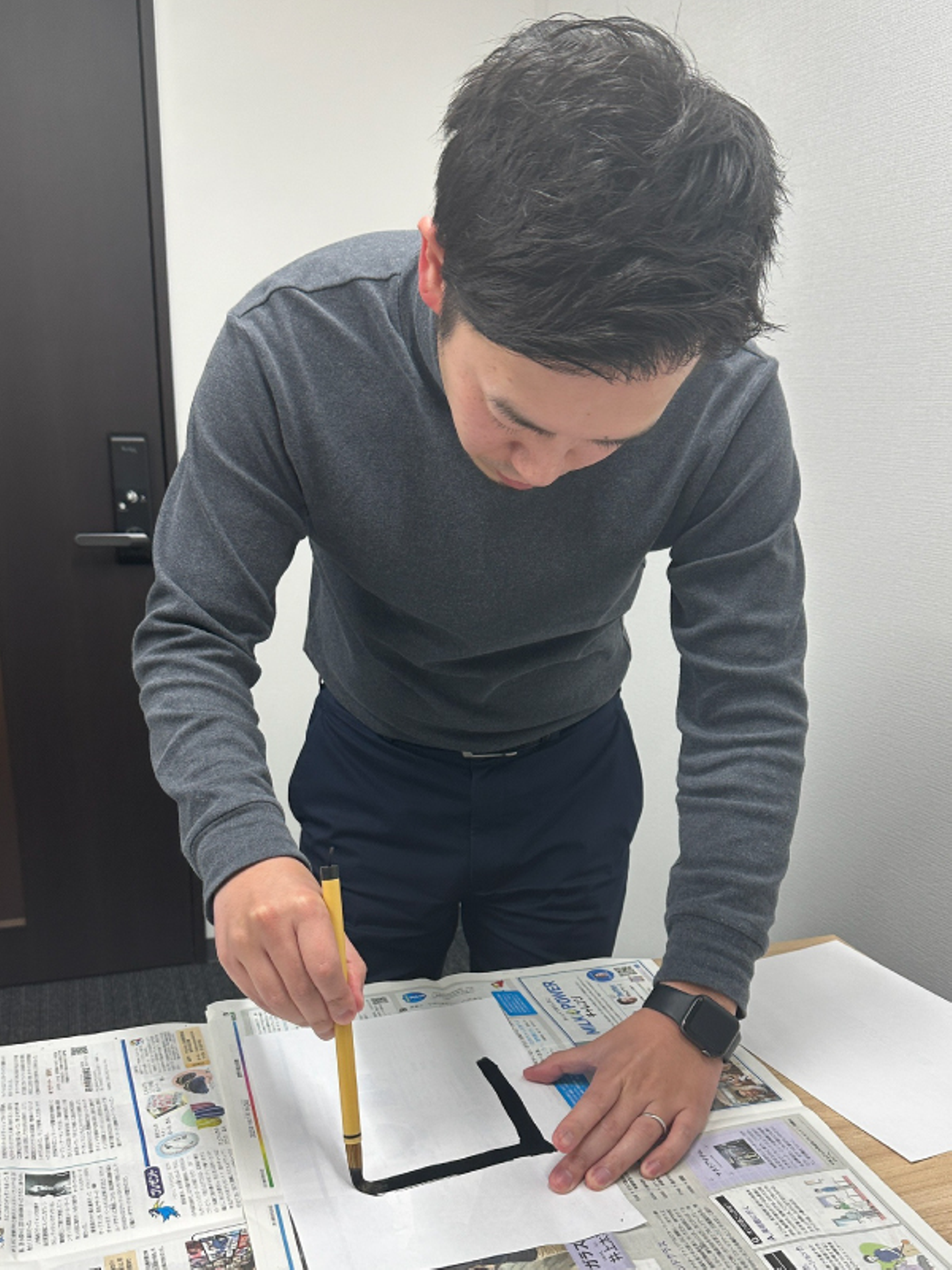 墨汁と筆は買ったはいいものの、半紙とすずりを用意し忘れ、半紙はコピー用紙で、すずりは紙コップで代用。さらに代表からは「文鎮無くない?」とご指摘もいただきました…。
