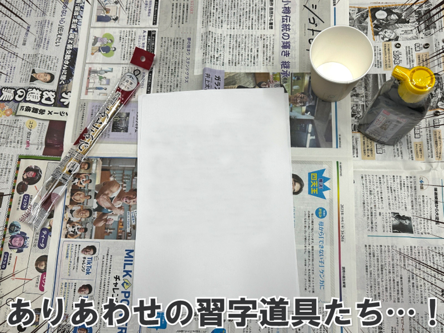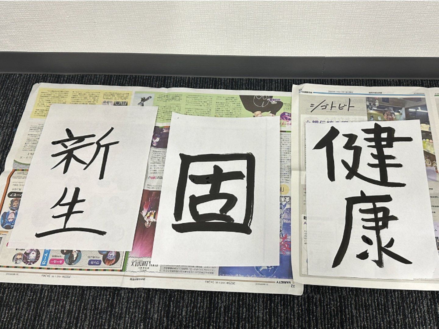 習字のときって、こんなふうに書いた習字を新聞紙を敷いた床の上で乾かしてましたよね~。by佐藤