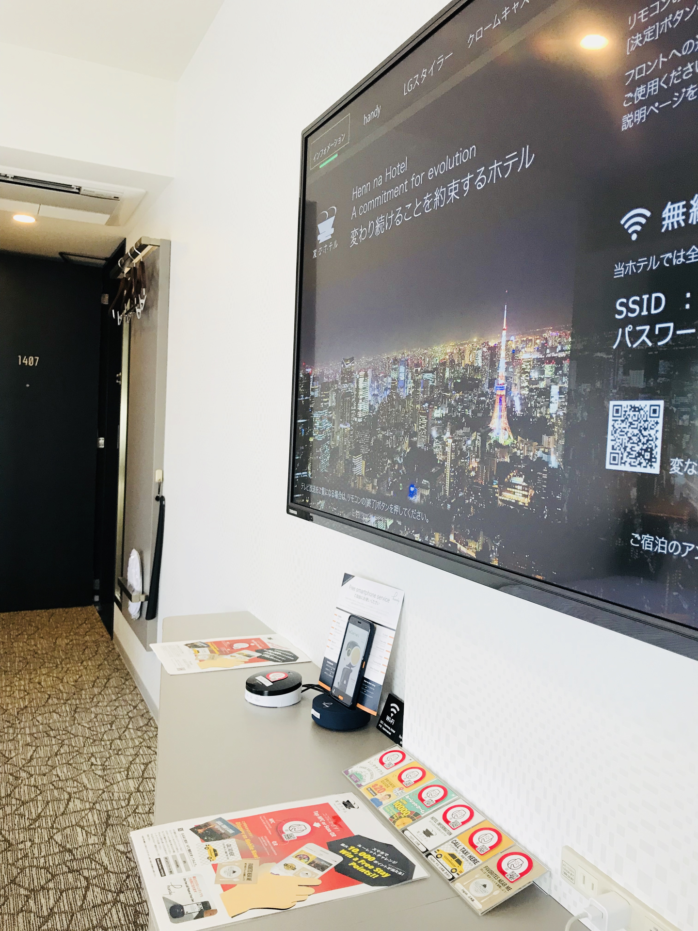 従来は、ホテルや旅館の施設案内は、紙でお部屋に置かれていますよね?あれをスマートプレートからスマホに配信しました。ペーパレス!!
