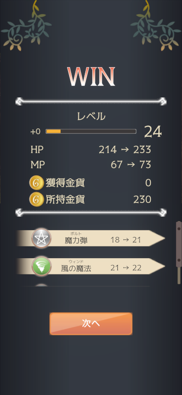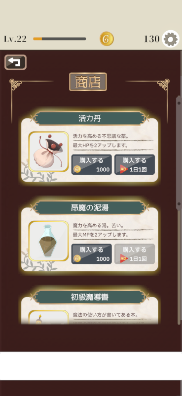 商店では、余った金貨や1回の動画広告視聴で、HP/MPや個別の呪文を強化することができます。