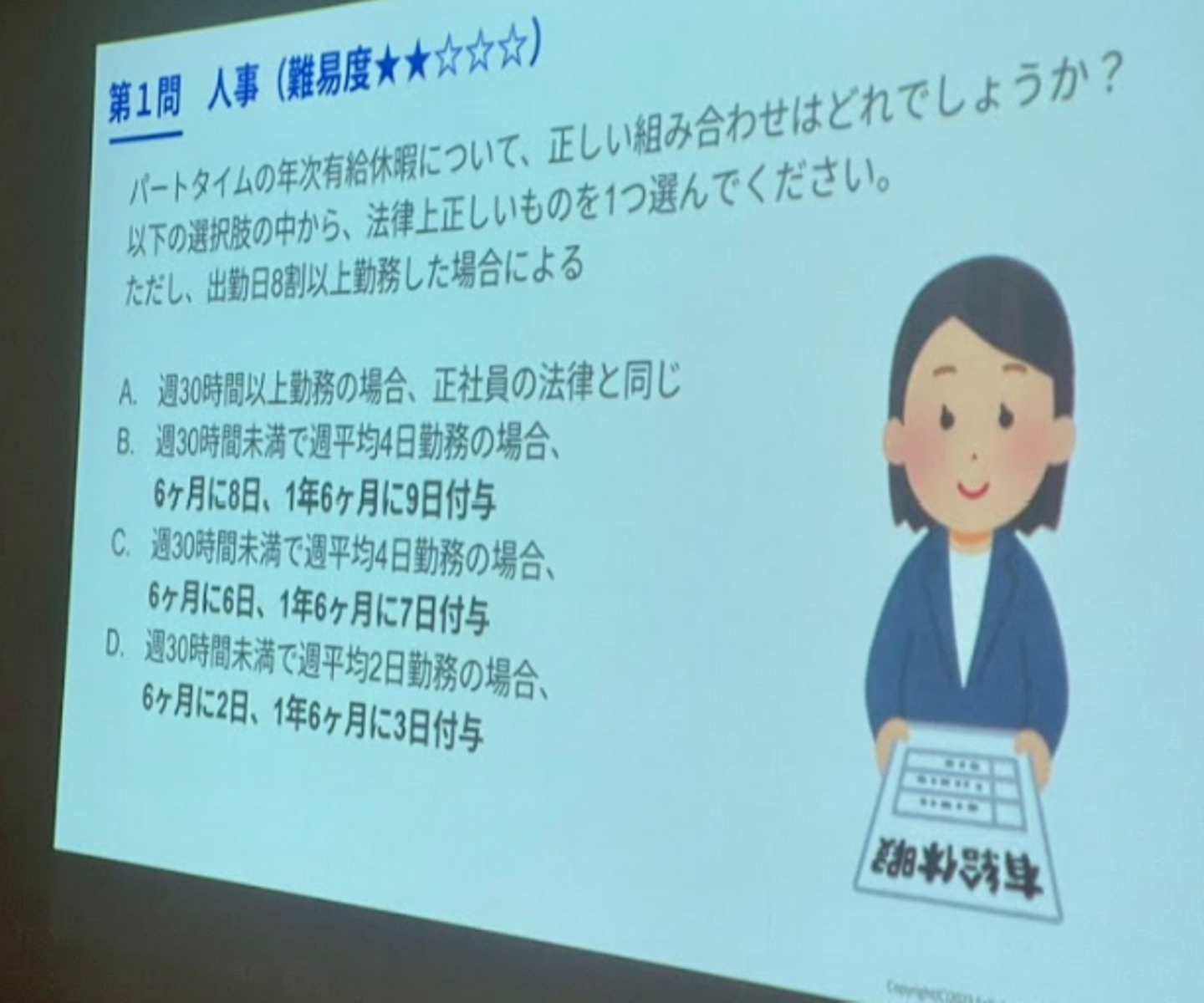 クイズは、人事部門から4問、経理部門から4問の計8問で構成。