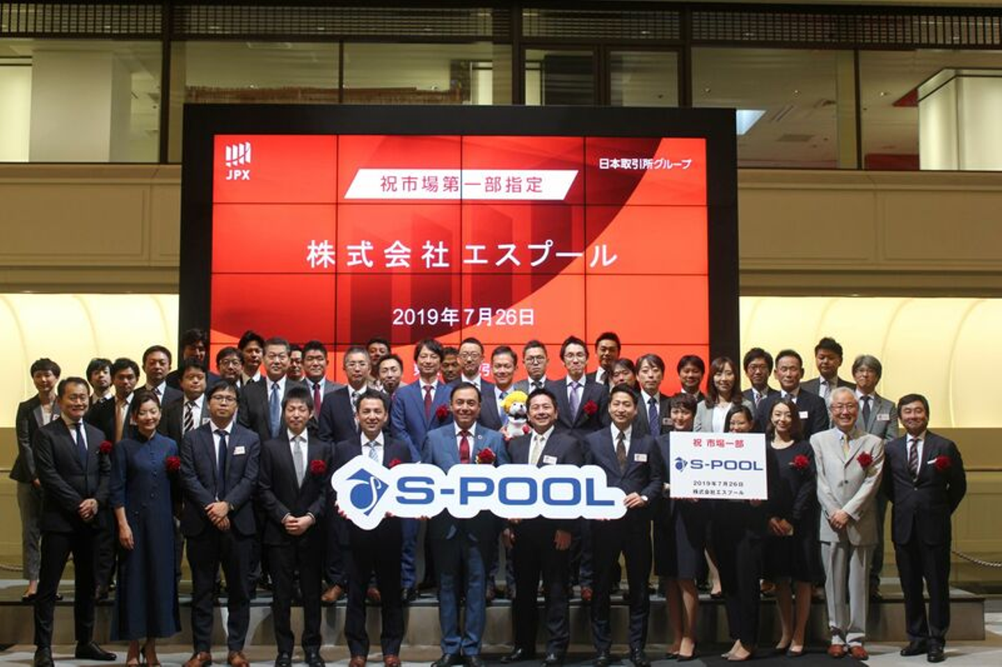 ▲2019年7月26日、東証一部上場を果たした(渡辺は前列左から4番目)
