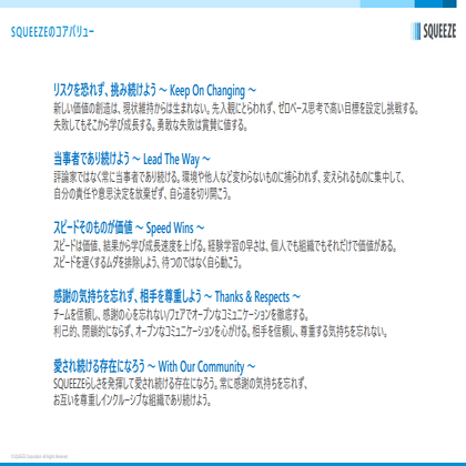 チームワークについては特に意識しています。SQUEEZE全体で「Thanks & Respects」(※SQUEEZEコアバリュー)の精神が根付いており、他の施設とも協力し合い、助け合いながら業務をスムーズに進めています。SQUEEZEの良さは、全国に店舗があっても、どの施設でも同じ意識を持って働いている点。距離に関係なく自然と話せる環境が整っています。また、オンラインミーティングも定期的に行われているため、リモートでも仲良くなれるのも特徴です。こうしたオープンで協力的な雰囲気は、SQUEEZEならではの魅力です。