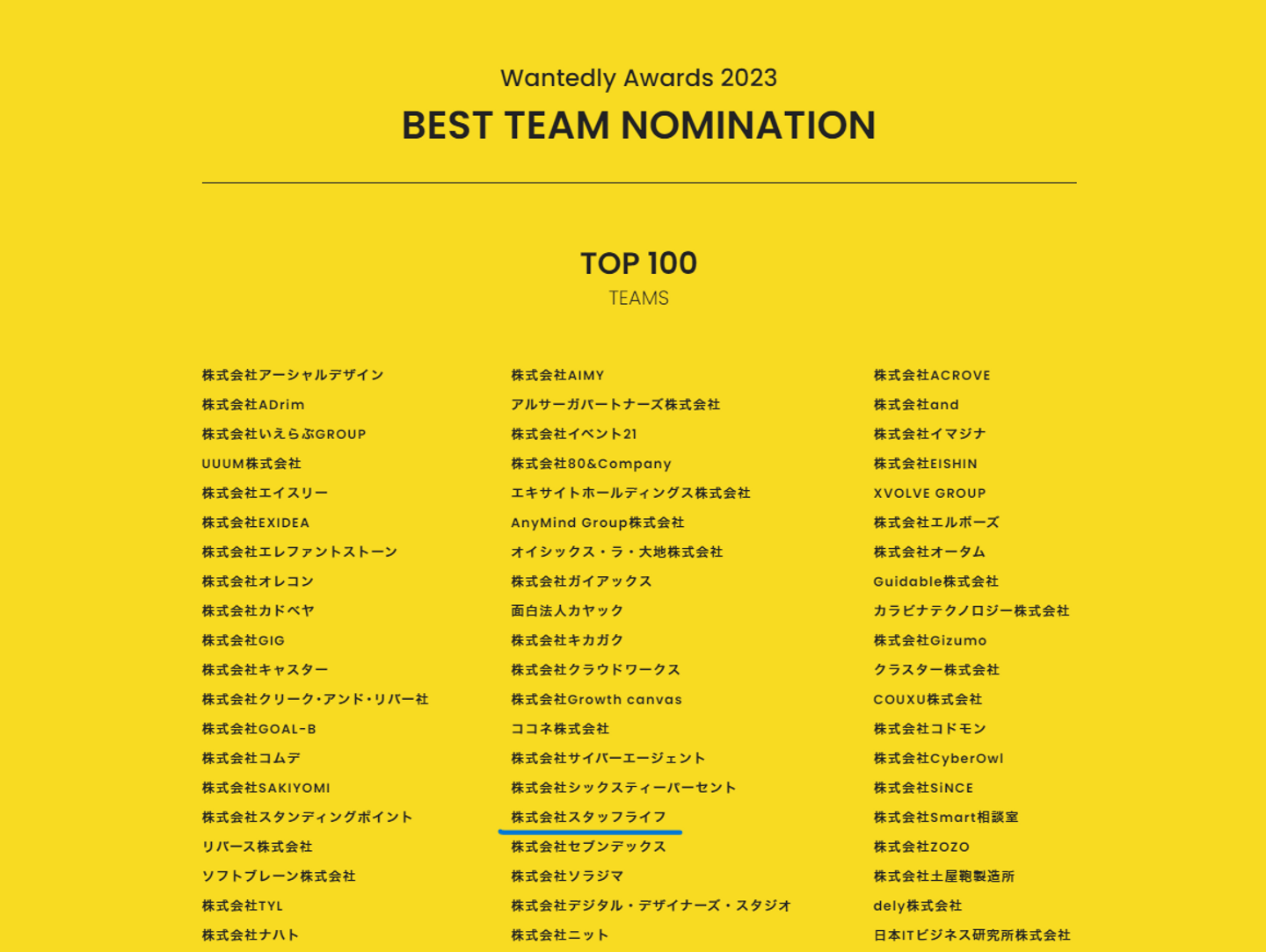 BEST TEAM NOMINATIONにおいて、約42,000社のWantedy利用企業の中から、非常にありがたいことに100社の中に選んでいただきました!!✨✨