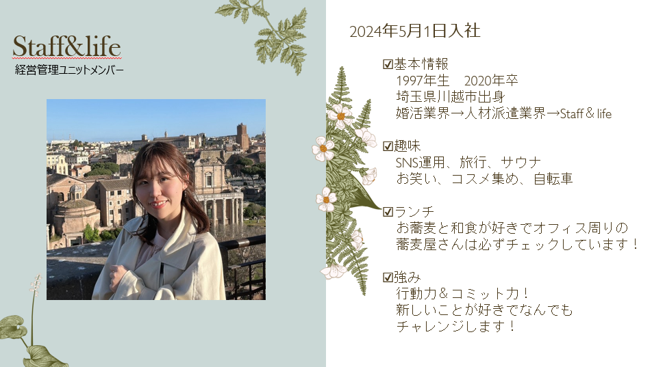 2024年5月にスタッフライフに入社いたしました!Aiharaと申します。