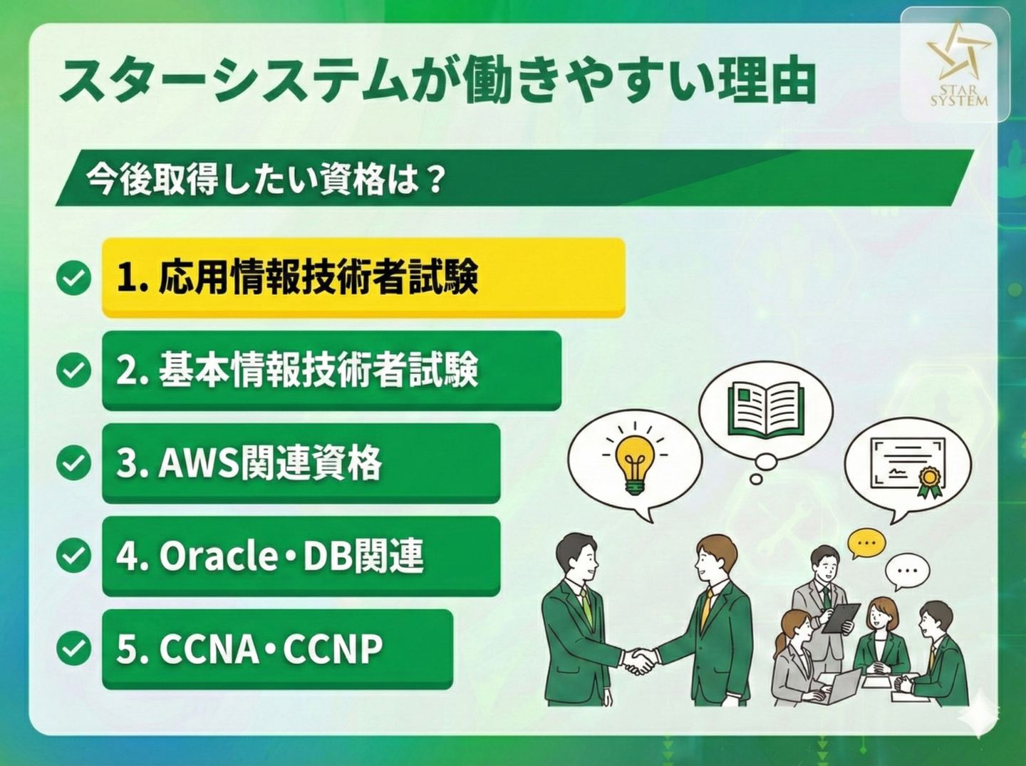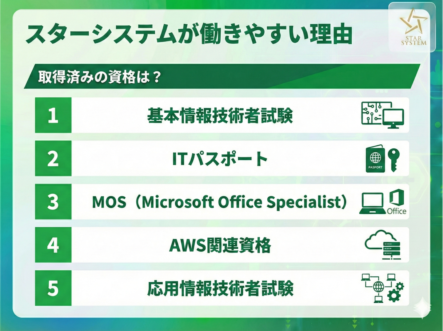 スキルアップに前向きな社員が多いのも、スターシステムの特徴です。アンケートでは「ITパスポート」や「基本情報技術者試験」をはじめ、「AWS」や「Oracle」などの資格を取得している人が多数。「現場で学んだ知識を形にしたい」という声が多く、学びをキャリアに変えていく姿勢がうかがえます。