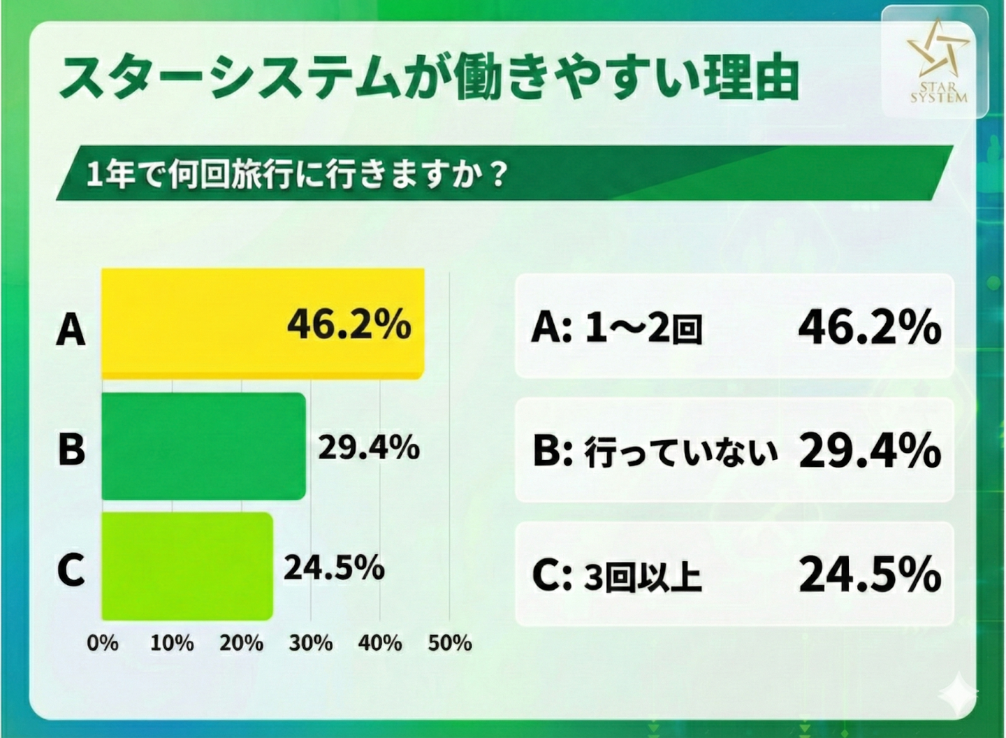 スターシステムで働く人の趣味第1位が旅行ということで、どのくらいの頻度で旅行に行っているのか気になりますよね。