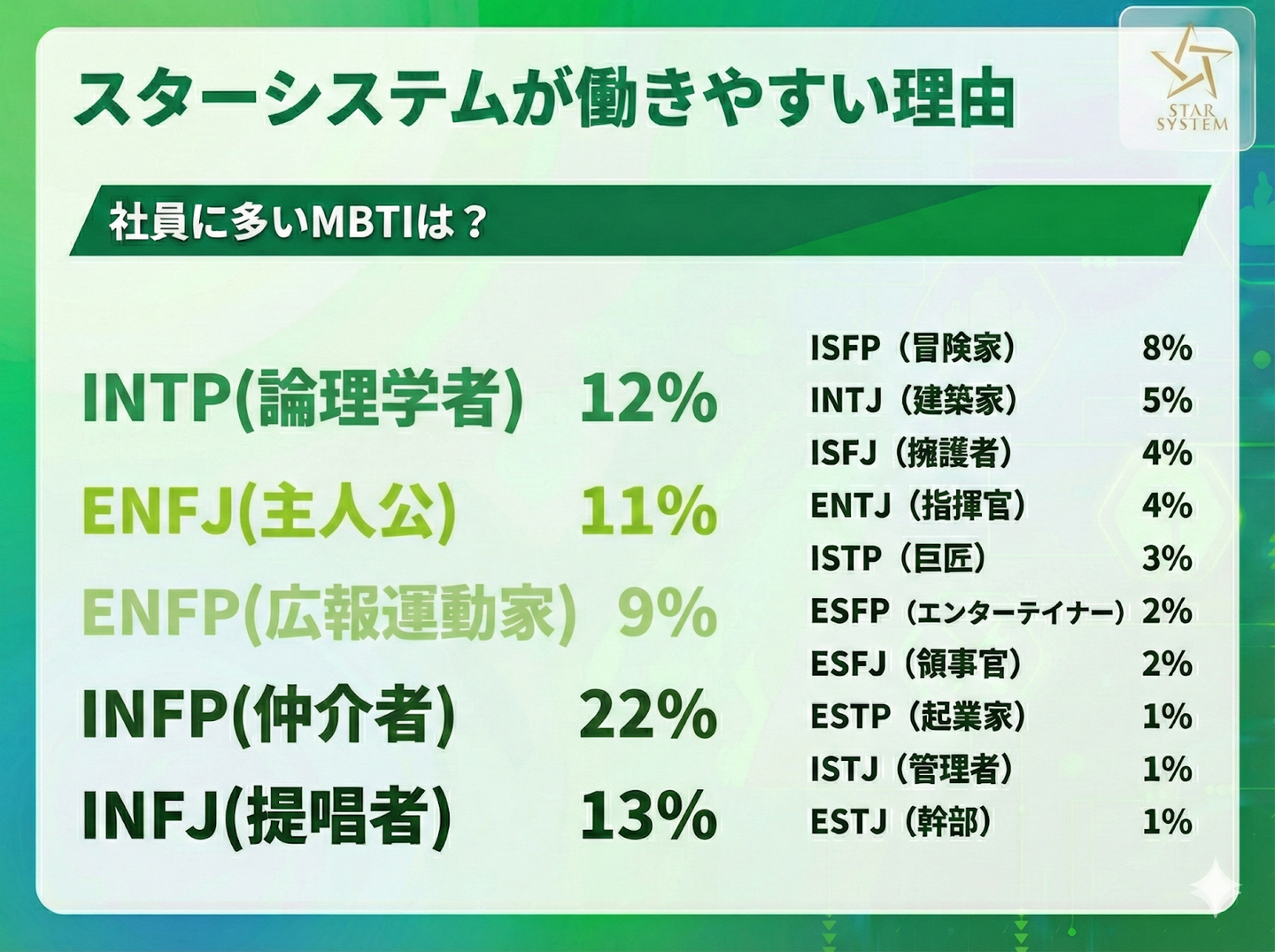 「MBTI」とは、16のタイプで性格を診断する手法です。性格を理解して自分自身を理解し、他者の特性も理解できる。どんな職場が向いているかなどを判断するのに用いられるものです。スターシステムでMBTI診断をしてみると、以下のような結果がでました。