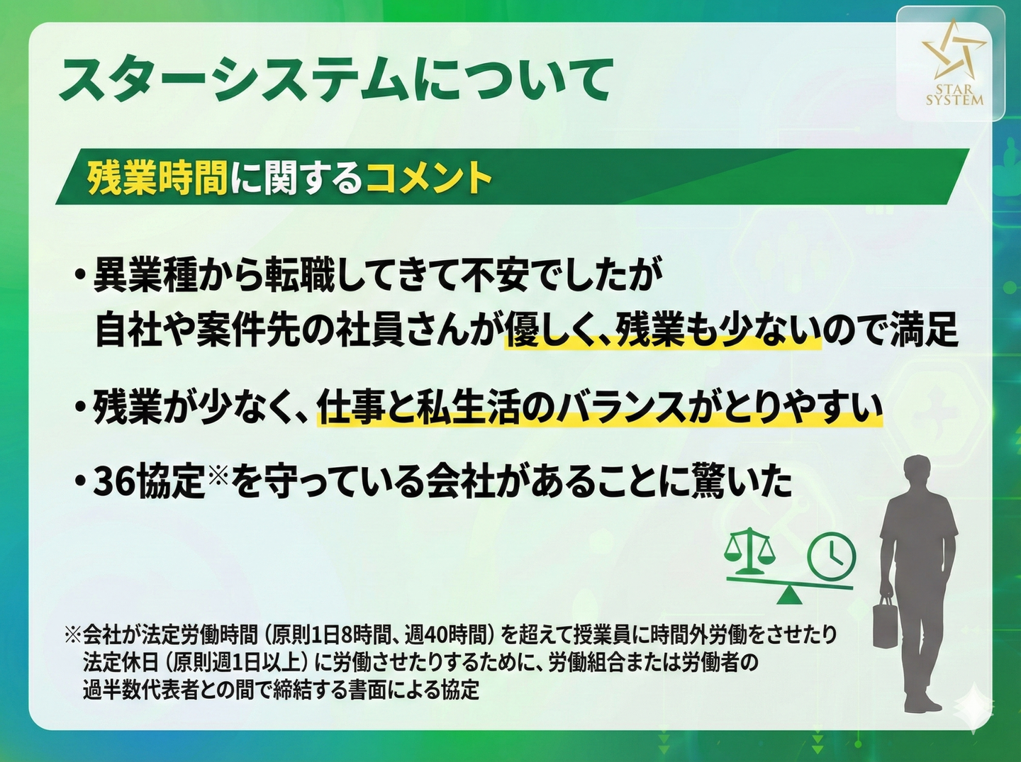 厚生労働省の調査による平均残業時間は「13.5時間」と出ていますので、スターシステムは一般的な企業よりも残業時間が少ないといえます。